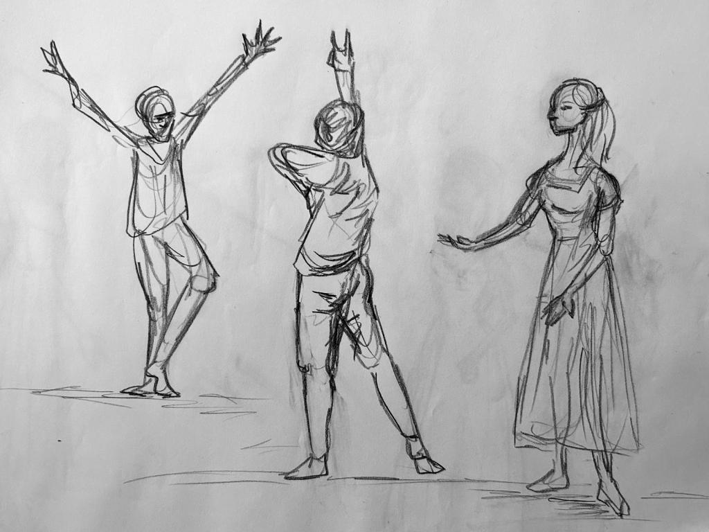Once seen and surely never forgotten is the Glove Scene. Bathilde, Albrecht’s fiancée, removes one of her gloves with deliberation and drops it on the floor for Giselle to pick up. Her cruel power game plays out in stillness: Giselle holds her rival’s gaze with confidence and defiance as she calmly returns the glove. But it is not Giselle who has retrieved the glove. No. The other character in this triangle is Hilarion. It is he who has stooped down to pick the glove up from the ground and has attempted in vain to make Giselle bow her head before Bathilde. He has managed to force the other Outcasts to bow down before the Landlords, but Giselle he cannot control.