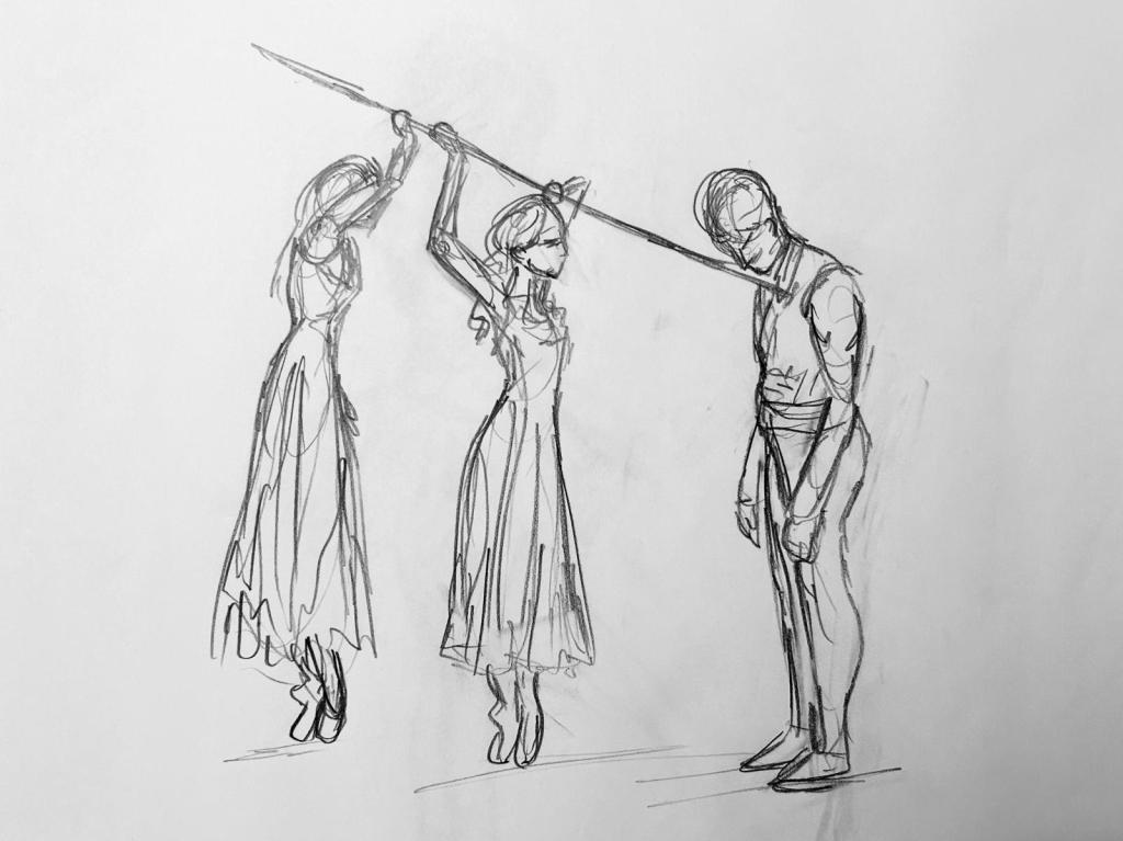 The fates of Giselle herself and Hilarion are sealed at the moment when triangular relationships collide into a deadlock. Giselle has dared to insert herself and her unborn baby into the “neat” triangle of the Landlord, Bathilde and Albrecht, that is, the triangle that will keep power in the hands of the powerful and keep it removed from the powerless. Giselle pulls Albrecht’s hand to her belly, holding it there so he can feel their bond. But feeling instead the glare of the Landlord and Bathilde’s penetrating eyes upon him, Albrecht wrenches his hand away, throwing Giselle to the ground. Then he literally turns his back on Giselle to walk off stage with Bathilde.